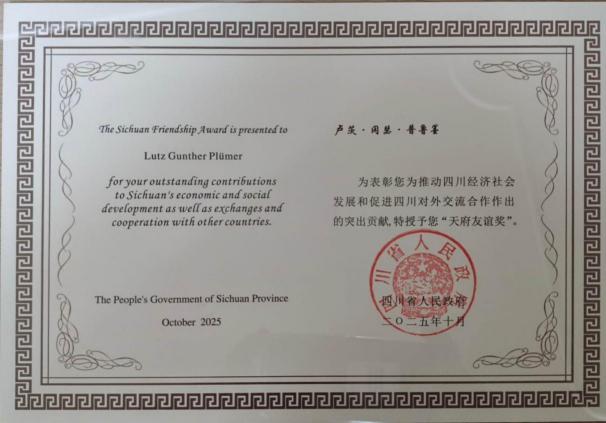 本年度四川省共有5位外国专家获此表彰。自设立以来,“天府友谊奖”已累计授予100余位来自全球各地的优秀外国专家。Lutz Plümer教授获此荣誉,是对他在校工作贡献的高度认可,也是对我校“外专引智”工作成效的充分肯定。学院将继续推进国际化建设工作,为我校持续深化国际人才交流合作,汇聚全球智慧力量,服务国家战略与地方经济社会发展贡献更大力量。