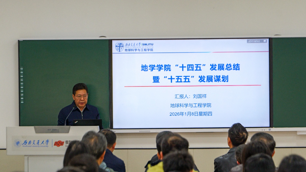 “十四五”发展总结暨“十五五”发展谋划汇报。刘院长系统回顾了“十四五”期间学院在学科建设、人才培养、师资队伍建设、教学科研创新、国际化交流合作等关键领域取得的突破性进展与标志性成果。他强调,这些成就的取得离不开全院师生的共同奋斗;面向“十五五”,学院要坚持党建引领,深化党建与业务融合,聚焦高质量发展、高水平建设这一目标,持续优化学院治理体系,加强人才引进和培育,深耕学科专业建设,深化基础理论研究,坚持立德树人,全面提升地学人才培养质量。